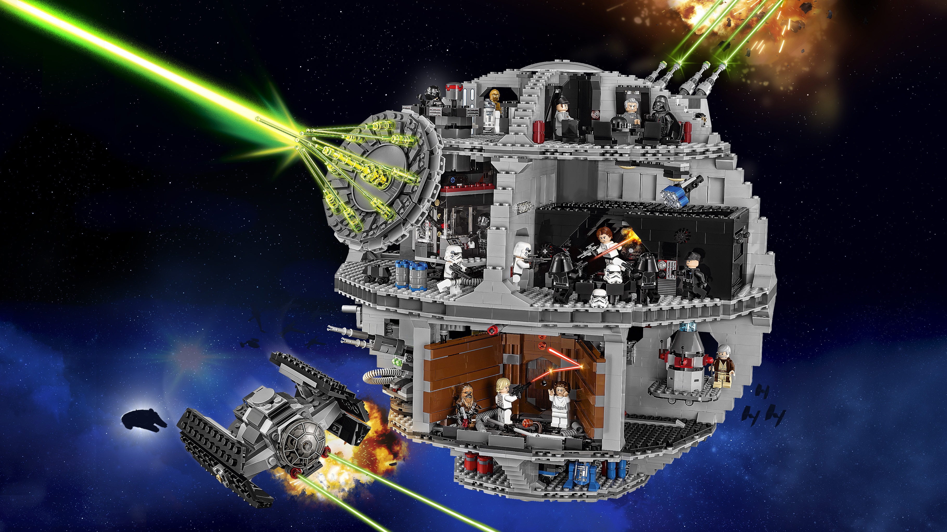 ?? Contine o camera de control a superlaserului, o camera de conferinte imperiala, hangar cu suport mobil de lansare si TIE Advanced detasabil cu spatiu pentru Lord Vader, camera tronului imparatului Palpatine, camera de intretinere a droizilor, zona de arest, compactor de gunoi, razp de tractare, zona pentru incarcatura, laser turbo cu tunuri pe arc si locuri pentru cei 2 artileristi Death Star, si 2 lasere turbo mobile pentru turn.