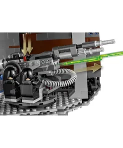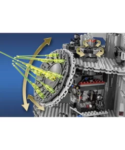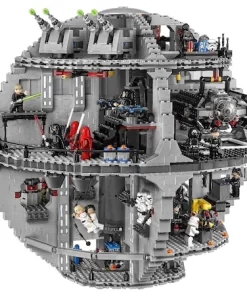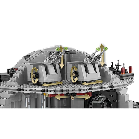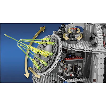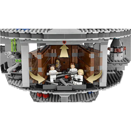 Preia comanda armei imperiale supreme – Death Star! Acest uimitor model Razboiul stelelor are atatea incaperi, camere, hangare grozave, si altele, incat nu vei sti cu ce sa incepi. Actioneaza superlaserul gigant din camera de comanda, planifica misiuni in camera de conferinte, si lanseaza TIE Advanced al Lordului Vader din compartimentul hangar. Fixeaza droizi in camera de intretinere, tine prizonierii in blocul de detentie si infrange navele stelare rebele cu laserul turbo lansator cu arc, turnurile turbo laser si puternica raza de tractiune. Il poti chiar vizita pe Imparatul Palpatine in camera tronului, poti pune totul in miscare in zona incarcaturii, si poti scoate gunoiul in compactorul de gunoi. Si fireste, nicio poveste cu Death Star nu poate fi completa fara ObiWan Kenobi, Luke Skywalker si Han Solo, care fac tot ce le sta in putinta pentru a distruge teribilul Death Star al Imperiului! Vor zadarnici ei oare planurile lui Vader si ale celorlalte personaje imperiale? Soarta Death Star este in mainile tale?